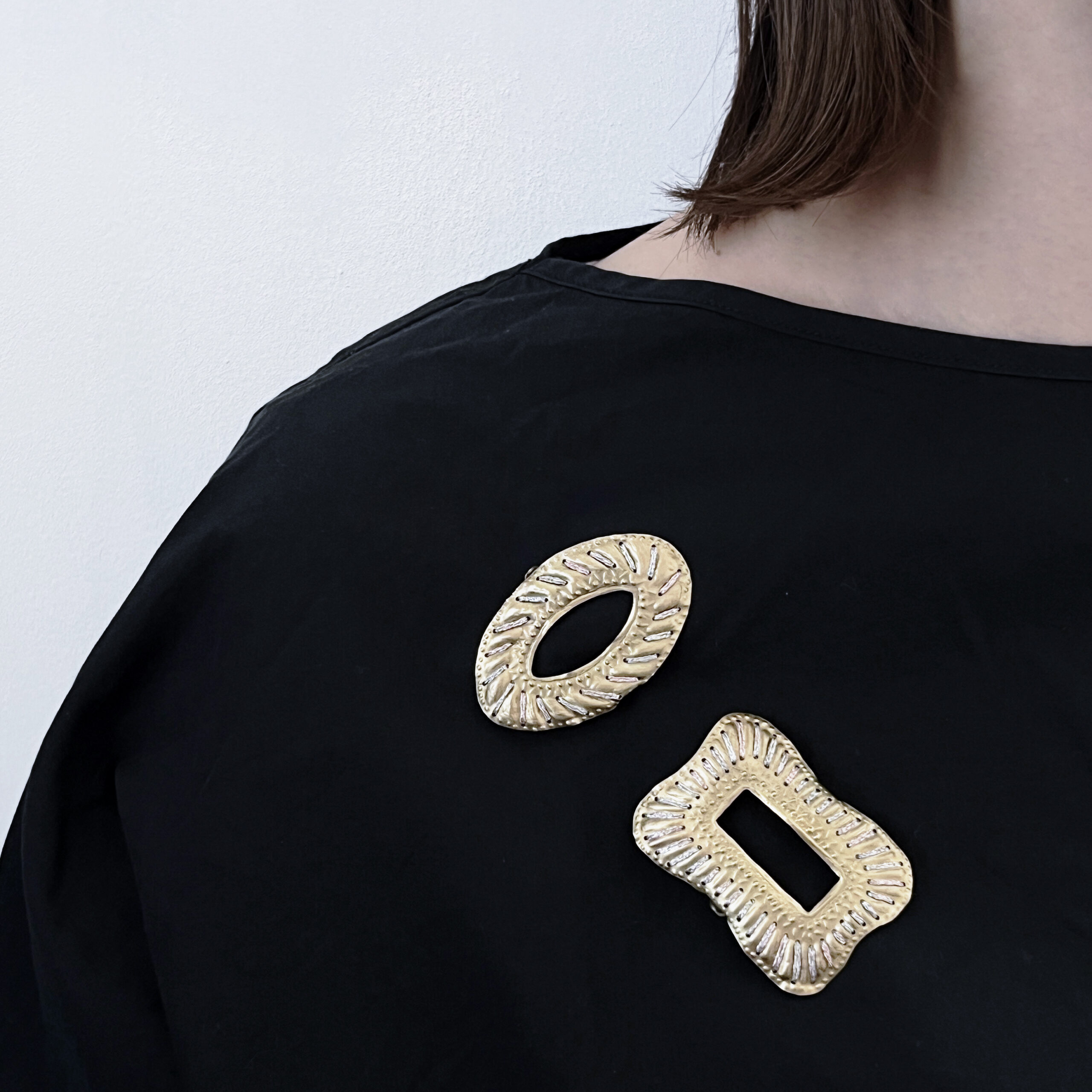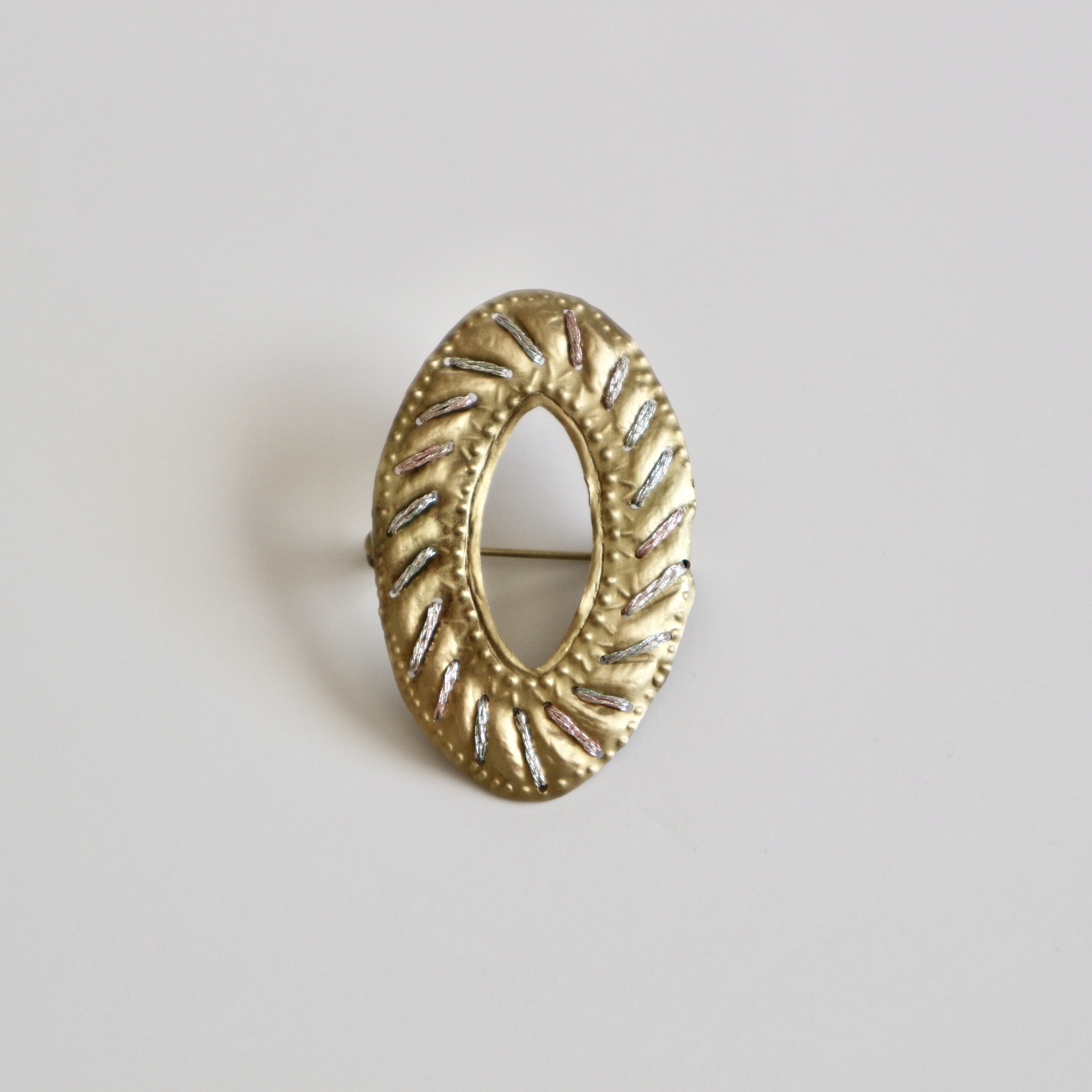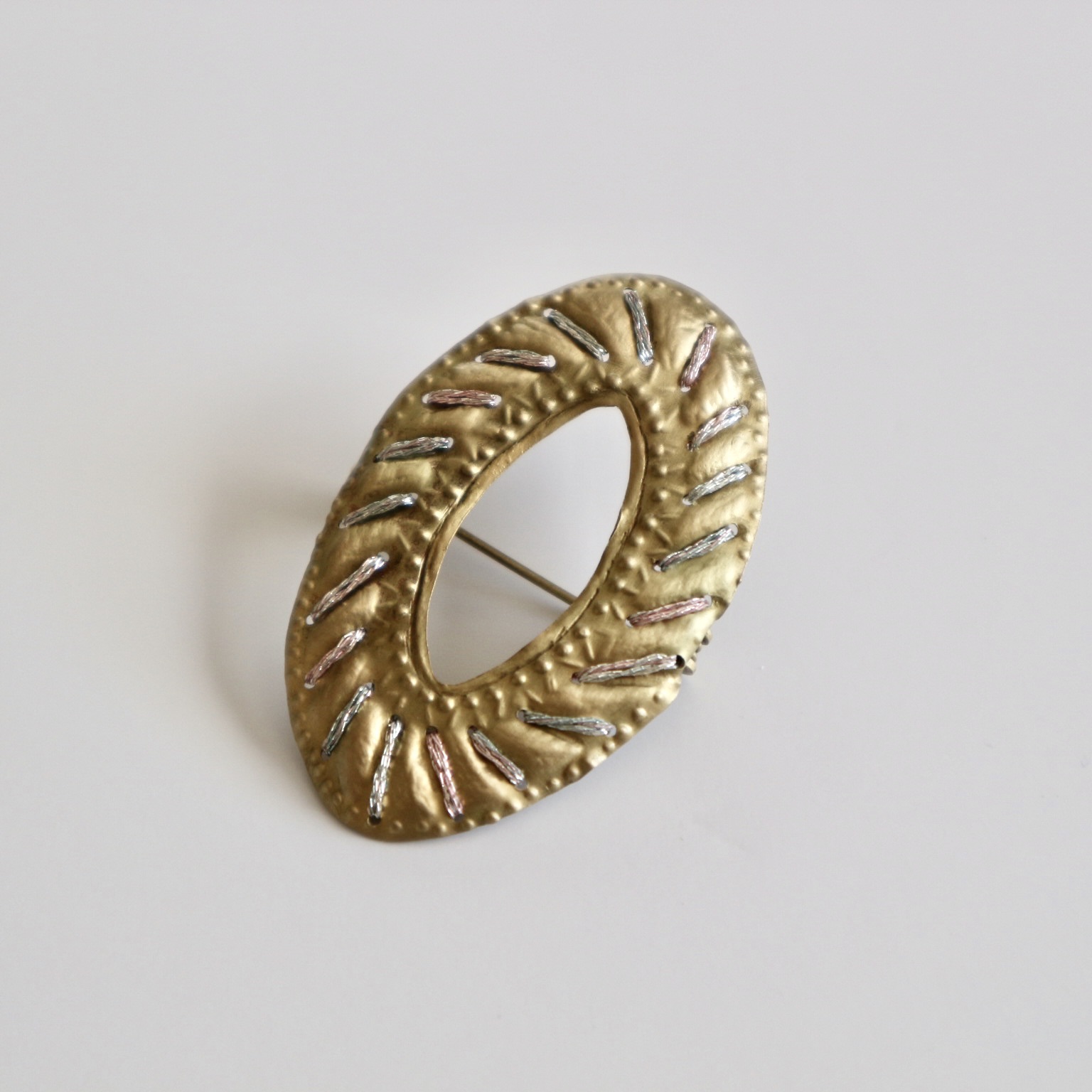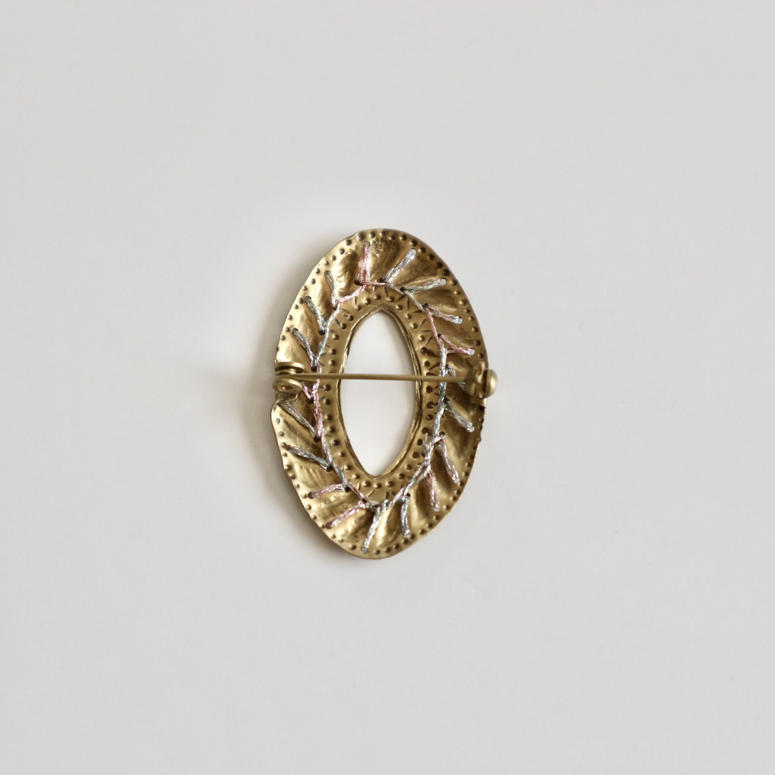 刺繍糸と真鍮を組み合わせたブローチ。
