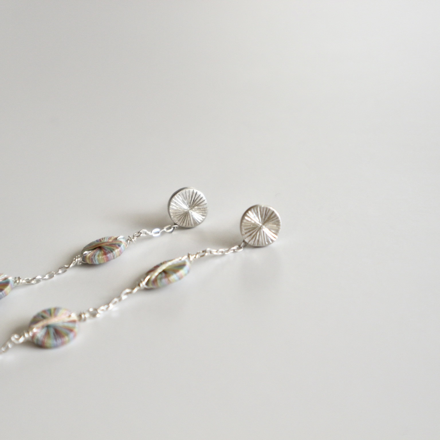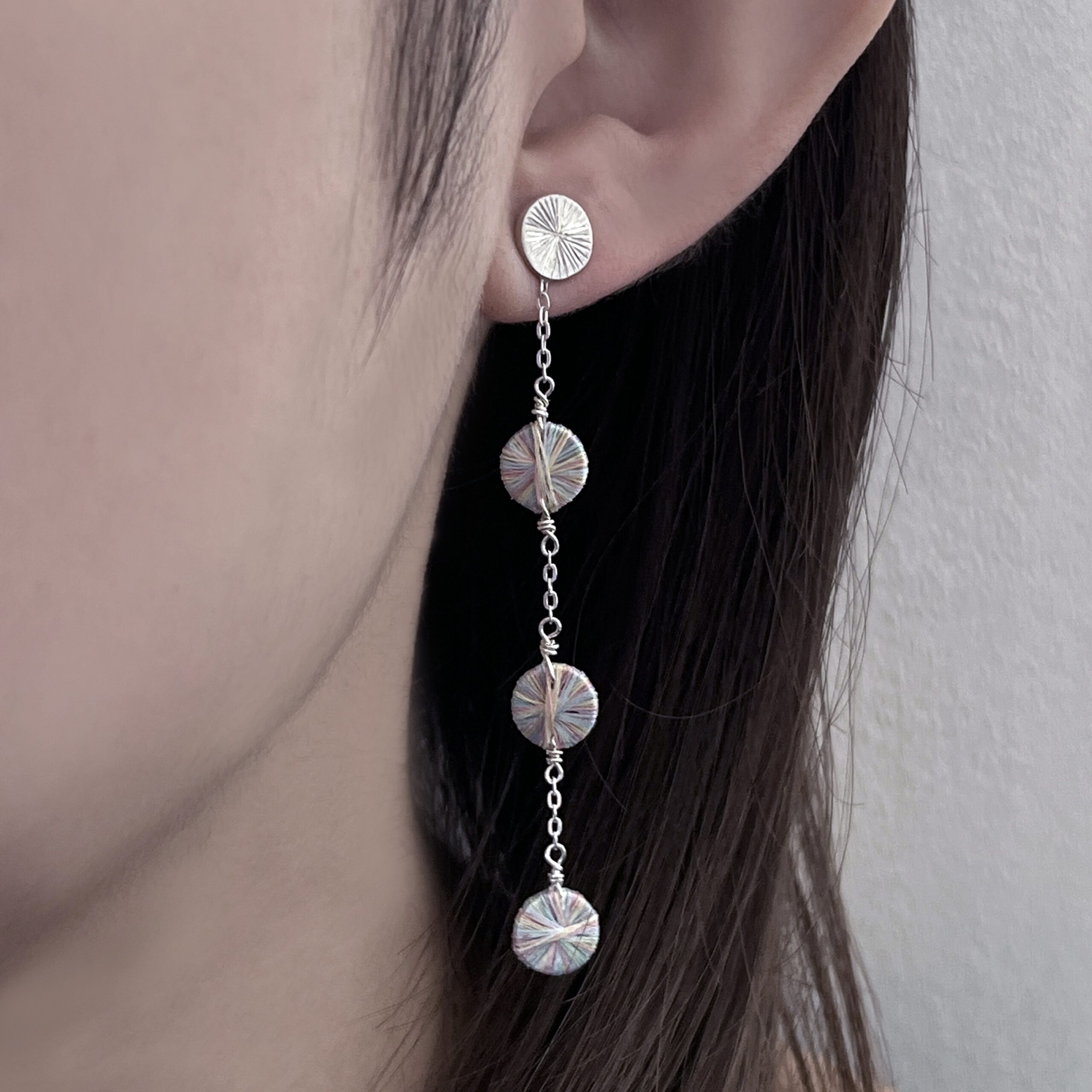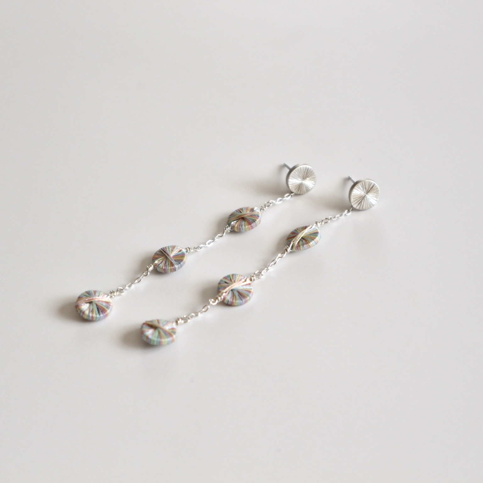 刺繍糸とシルバーを組み合わせたスタッドチェーンピアス。