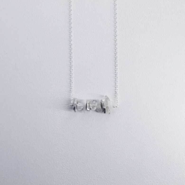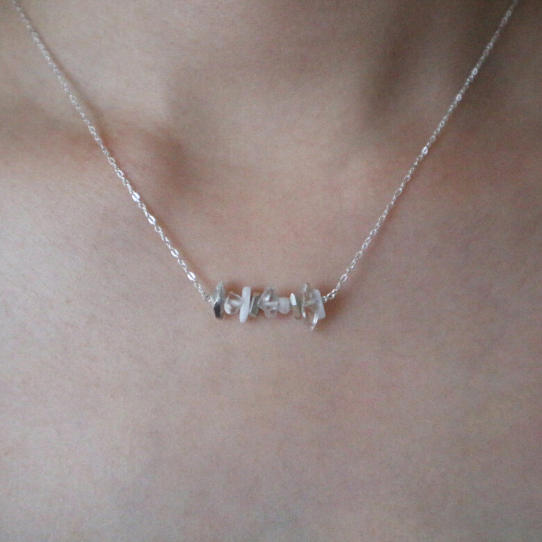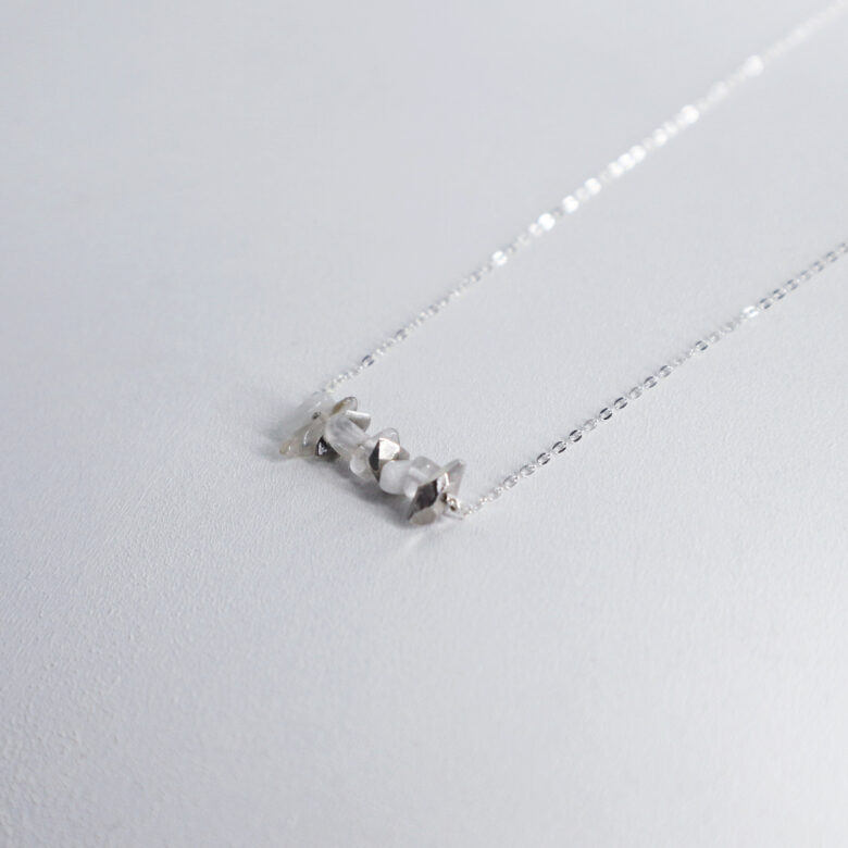 水晶とムーンストーンのさざれ石と、石の形をしたシルバーを積重ね、透明感のある作品となっております。